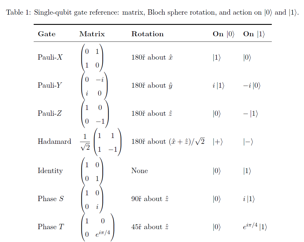 Quantum gates are unitary matrices U satisfying UU† = I, which preserve the state-vector norm. On the Bloch sphere, every single-qubit unitary corresponds to a rotation: a rotation by angle α about axis ˆn = (nx, ny, nz) is
