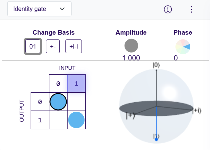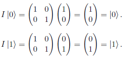 In quantum computing, the identity gate matrix is represented by the identity matrix, I. The identity gate leaves the qubit state completely unchanged — a zero-degree rotation. It is represented in circuit diagrams as a box labelled I.