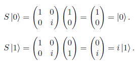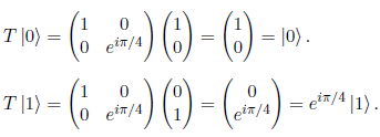 As with the S gate, |0⟩ is unaffected. The state |1⟩ acquires the phase eiπ/4 = 1+i/ √2, representing a 45-degree rotation of the Bloch vector about ˆz.