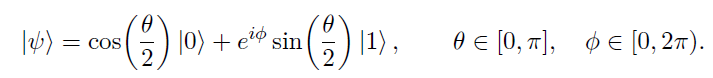 A single-qubit pure state lives in C2 and is written as |ψ⟩ = α |0⟩+β |1⟩, with |α|2 +|β|2 = 1. Absorbing the global phase, every pure state admits the Bloch parameterisation:
