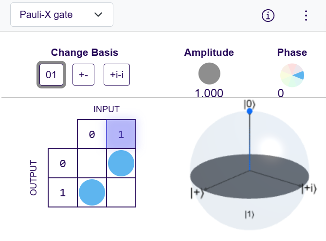 The Pauli-X gate is the quantum analogue of the classical NOT gate. It performs a π rotation about the x-axis of the Bloch sphere.