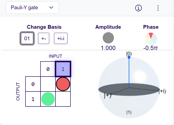 Like the X gate, Y swaps |0⟩ and |1⟩, but it also introduces imaginary phase factors ±i. On the Bloch sphere, the Bloch vector is again flipped between poles, but the rotation axis is ˆy.