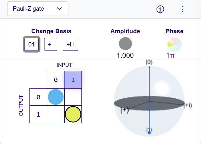 The Pauli-Z gate is a pure phase flip. It performs a 180-degree rotation about the z-axis of the Bloch sphere.