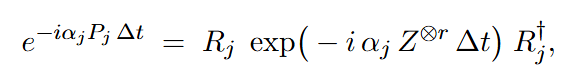 where Rj rotates the qubits so that Pj becomes Z⊗r (a diagonal operator), applies a phase rotation about Z (using standard CNOT “pack/unpack” patterns), and then rotates back.