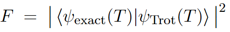 Fidelity (what the graph shows). If |ψexact(T )⟩ = e−iHT |ψ(0)⟩ and |ψTrot(T )⟩ is the Trotterized state, the overlap